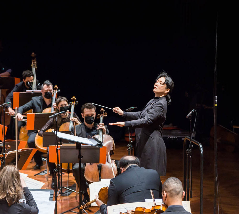 Sur le plateau de la MCP-grande salle, deux phalanges se sont réunies, l’Orchestre de Chambre de Genève et l’Orchestre de la Haute École de Genève aux côtés de la première soliste de la soirée, la violoniste bulgare Rada Hadjikostova. Allégorie de la nuit du sicilien Salvatore Sciarrino n’est pas à proprement parler un concerto même s’il débute très abruptement par des citations du célèbre concerto pour violon en mi mineur de Félix Mendelssohn passé au filtre déformant de la mémoire. La musique de Mendelssohn est très rapidement dissoute, aplanie et méconnaissable, la violoniste immobilisant son geste sur une note tenue dans l’aigu de son registre tandis que de l’orchestre quasi silencieux nous parviennent quelques manifestations bruités d’un paysage nocturne avec bruissements d’ailes et chants d’oiseaux (bisbigliandi des vents) : musique recyclée, dirons-nous, et écoute écologique prônée par notre compositeur. Étrange également est cette « cadence-oiseau » de la soliste, entre humour et poésie, jouée dans la zone des harmoniques extrême-aigus de l’instrument, juste avant le retour en force des salves instrumentales et bruyantes du concerto pour conclure la pièce. Le parti-pris théâtral est bien assumé par nos musiciens emmenés par le geste très concentré de Kanako Abe. Ici, à 1h54mn :